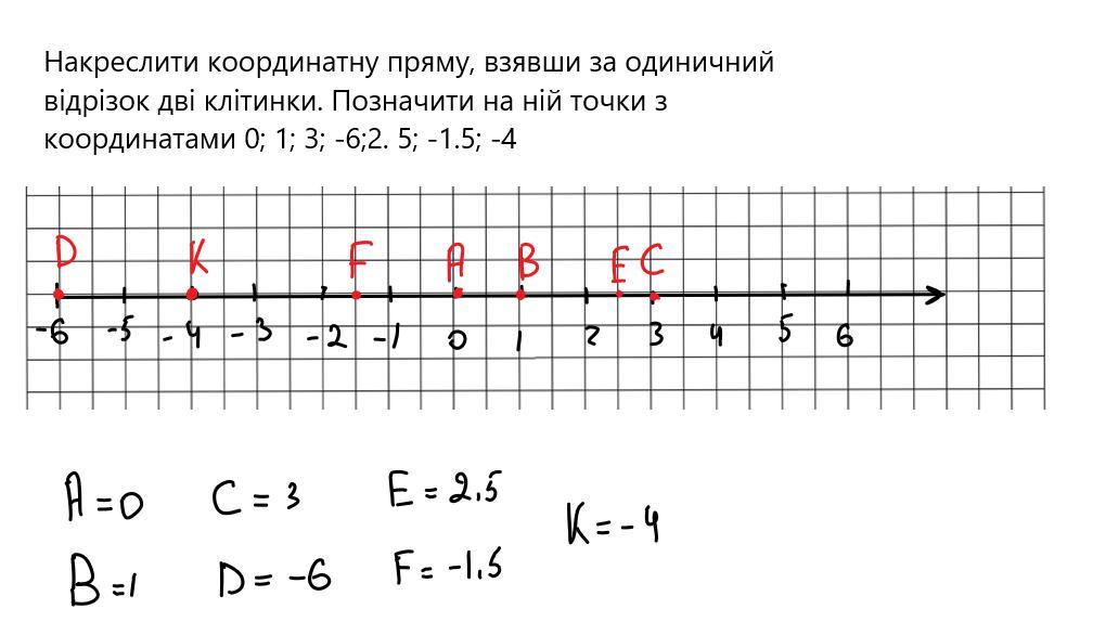 Накреслити координатну пряму, взявши за одиничний відрізок дві клітинки. Позначити на ній точки з координатaми 0; 1; 3; -6;2. 5; -1.5; -4.