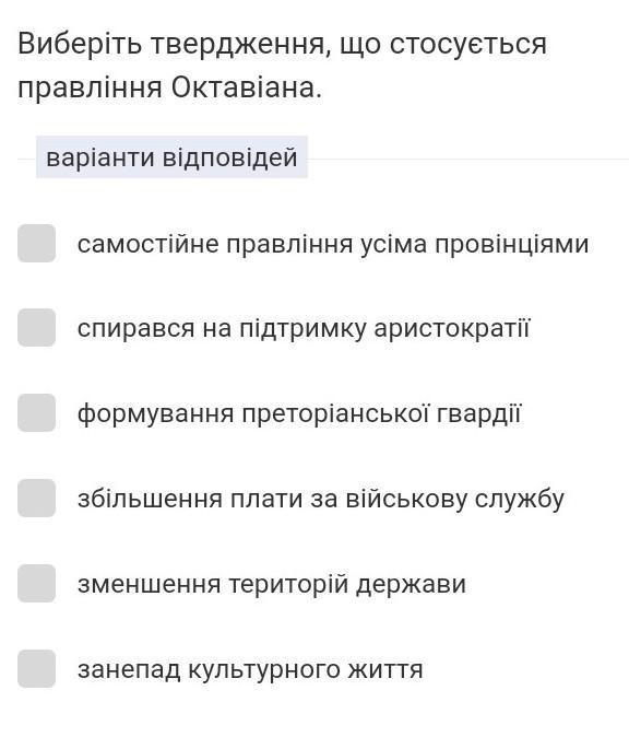 Виберіть твердження, що стосується правління Октавіана. варіанти відповідей самостійне правління усіма провінціями спирався на підтримку аристократії формування преторіанської гвардії збільшення плати за військову службу зменшення територій держави занепад культурного жИТТЯ