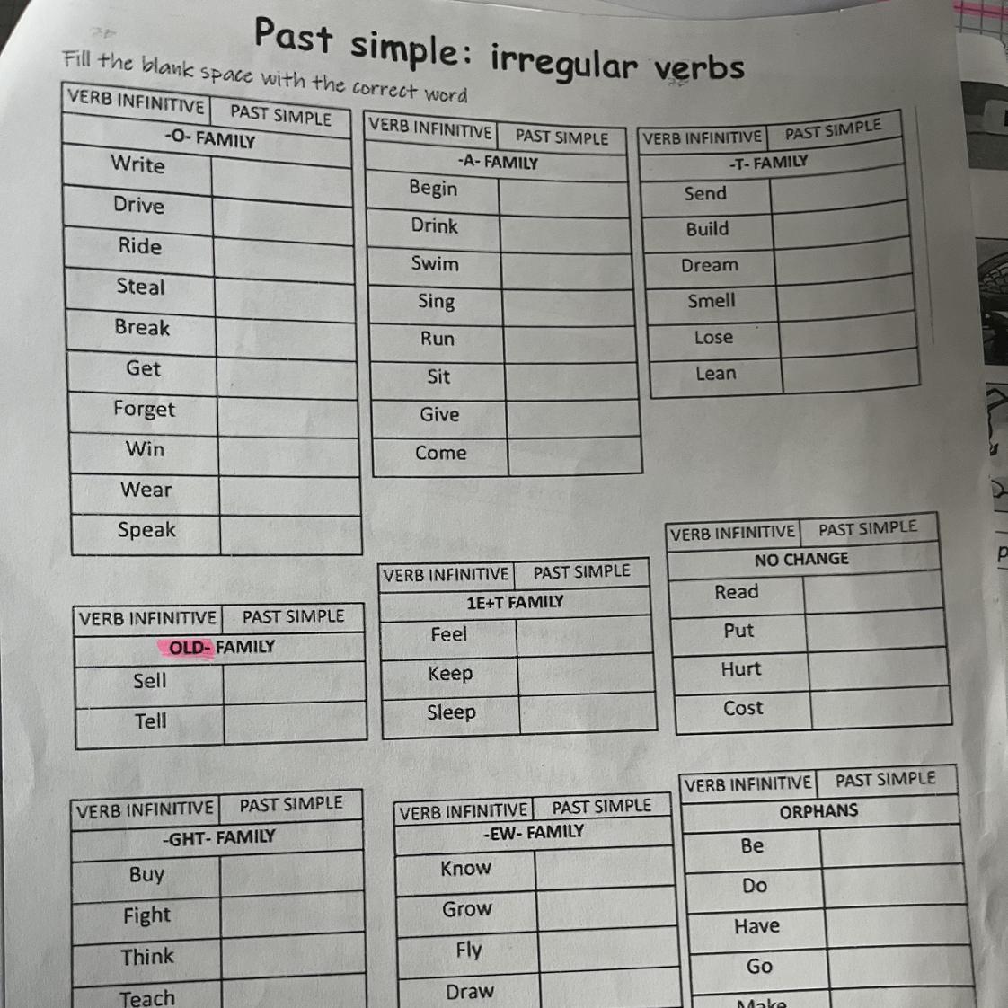 o family: write — wrote. drive — drove. ride — rode. steal — stole. break — broke. get — got. forget — forgot