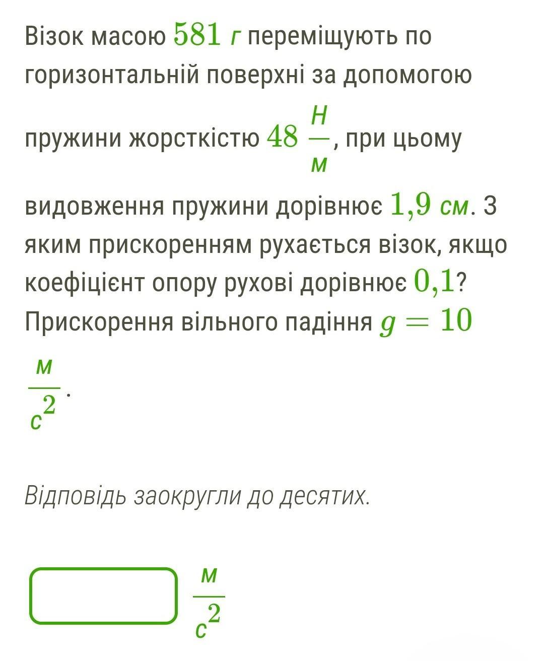 а=(kx-μmg)/m=(48*0,019-0,1*0,581*10)/0,581=0,57м/с²=0,6м/с²
