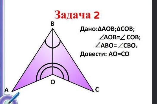 трикутник АОВ = трикутник СОВ за стороною та двома прилеглими до неї кутами (кут АОВ = кут СОВ, кут АВО = кут СВО, ВО - спільна сторона). Оскільки трикутник. АОВ і СОВ рівні, АО = СО.
