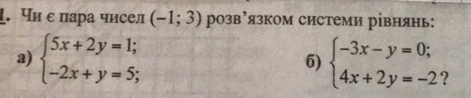 Якщо у одному рівнянні системи рівнянь з парою чисел яка дається не буде дорівнювати тому числу що після "=" то пара чисел не буде розв'язком системи рівнянь як у прикладі "б" ,а якщо все так як у прикладі "а" то в такій системі рівнянь така пара чисел як (-1;3) буде розв'язком цього рівняння. Сподіваюся що зрозуміло розказав
