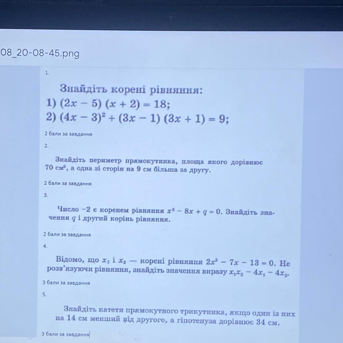 1: (2x-5)(x+2) = 18Розкриваємо дужки:2x^2 - x - 10 = 18Переносимо все в одну сторону та скорочуємо:2x^2 - x - 28 = 0Знаходимо корені за допомогою формули дискримінанту:D = b^2 - 4ac = (-1)^2 - 4(2)(-28) = 225x1 = (-b + √D) / 2a = (1 + 15) / 4 = 4x2 = (-b - √D) / 2a = (1 - 15) / 4 = -3.5Відповідь: x1 = 4, x2 = -3.5.