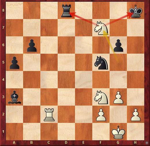 2. картинка : Какой шахматист не знает о вилке конём? Вряд ли мы сможем найти шахматиста, который не пострадал от выпада этого шахматного «животного». Белый конь нанёс двойной удар по королю и ладье. Чёрные вынуждены смириться с потерей ладьи