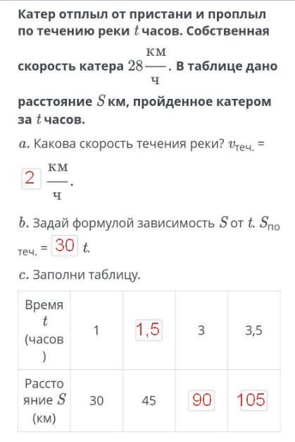 Из таблицы видно, что за 1 час катер проплыл 30 км, при собственной скорости 28 км/ч. Следовательно скорость течения v теч =30-28 = 2 км/ч.
