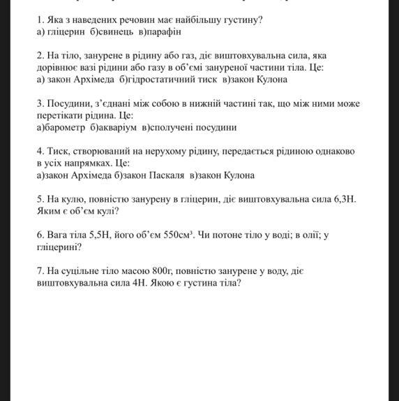 Вага тіла 5,5Н, його об'єм 550см. Чи потоне тіло у воді; в олії, у