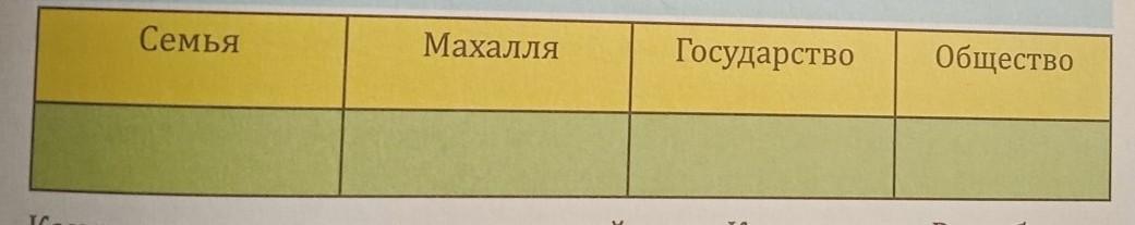2. Свяжите с воспитанием отношения между семьёй, махаллёй, государством и обществом, заполните в тетради приведённую ниже таблицу.