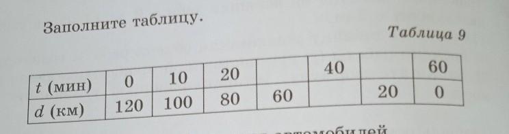 Два автомобиля, расстояние между которыми 120 км, выехали на- встречу друг другу. В таблице 9 дана зависимость расстояния между ними (d) от времени движения (t).
