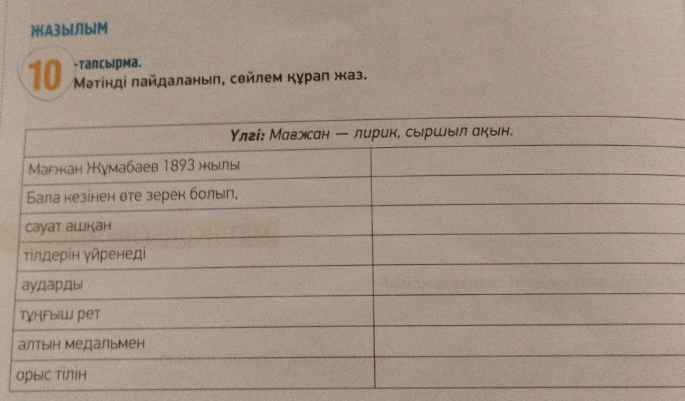 ЖАЗЫЛЫМ 10 -тапсырма. Мәтінді пайдаланып, сөйлем құрап жаз. Үлгі: Мағжан лирик, сыршыл ақын. Мағжан Жұмабаев 1893 жылы Бала кезінен өте зерек болып, сауат ашқан тiлдерін үйренеді аударды тұңғыш рет алтын медальмен орыс тiлiн