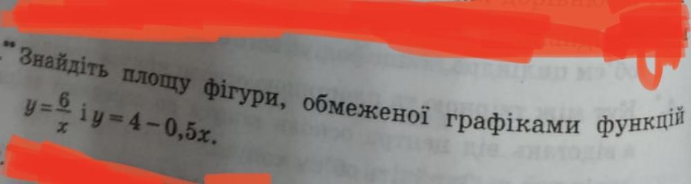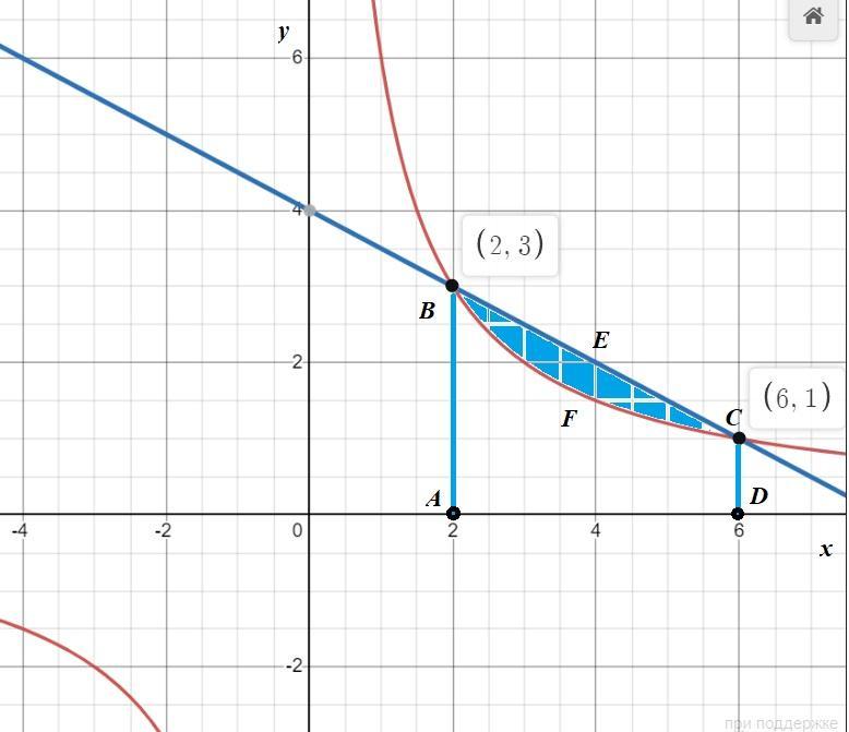 S=∫₂⁶(4-0.5x)dx - ∫₂⁶(6/x)dx=> 8-6.6 = 1.4 кв.ед.
