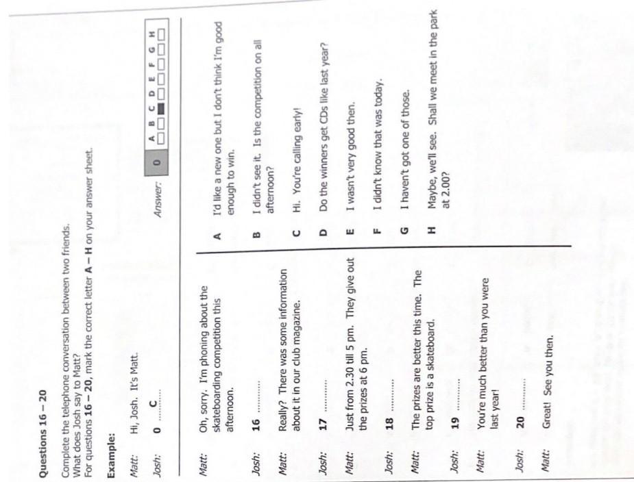 Questions 16-20 Complete the telephone conversation between two friends. What does Josh say to Matt? For questions 16-20, mark the correct letter A-H on your answer sheet. Example: Matt: Josh: Matt: Josh: Matt: Josh: Matt: Josh: Matt: Josh: Matt: Josh: Matt: Hi, Josh. It's Matt. C ************ 0 Oh, sorry. I'm phoning about the skateboarding competition this afternoon. 16............ Really? There was some information about it in our club magazine. 17 Just from 2.30 till 5 pm. They give out the prizes at 6 pm. 18.......... The prizes are better this time. The top prize is a skateboard. 19............ You're much better than you were last year! 20 Great! See you then. A B C D E F G H Answer: 0 A C D E F G H JOE I'd like a new one but I don't think I'm good enough to win. I didn't see it. Is the competition on all afternoon? Hi. You're calling early! Do the winners get CDs like last year? I wasn't very good then. I didn't know that was today. I haven't got one of those. Maybe, we'll see. Shall we meet in the park at 2.00?