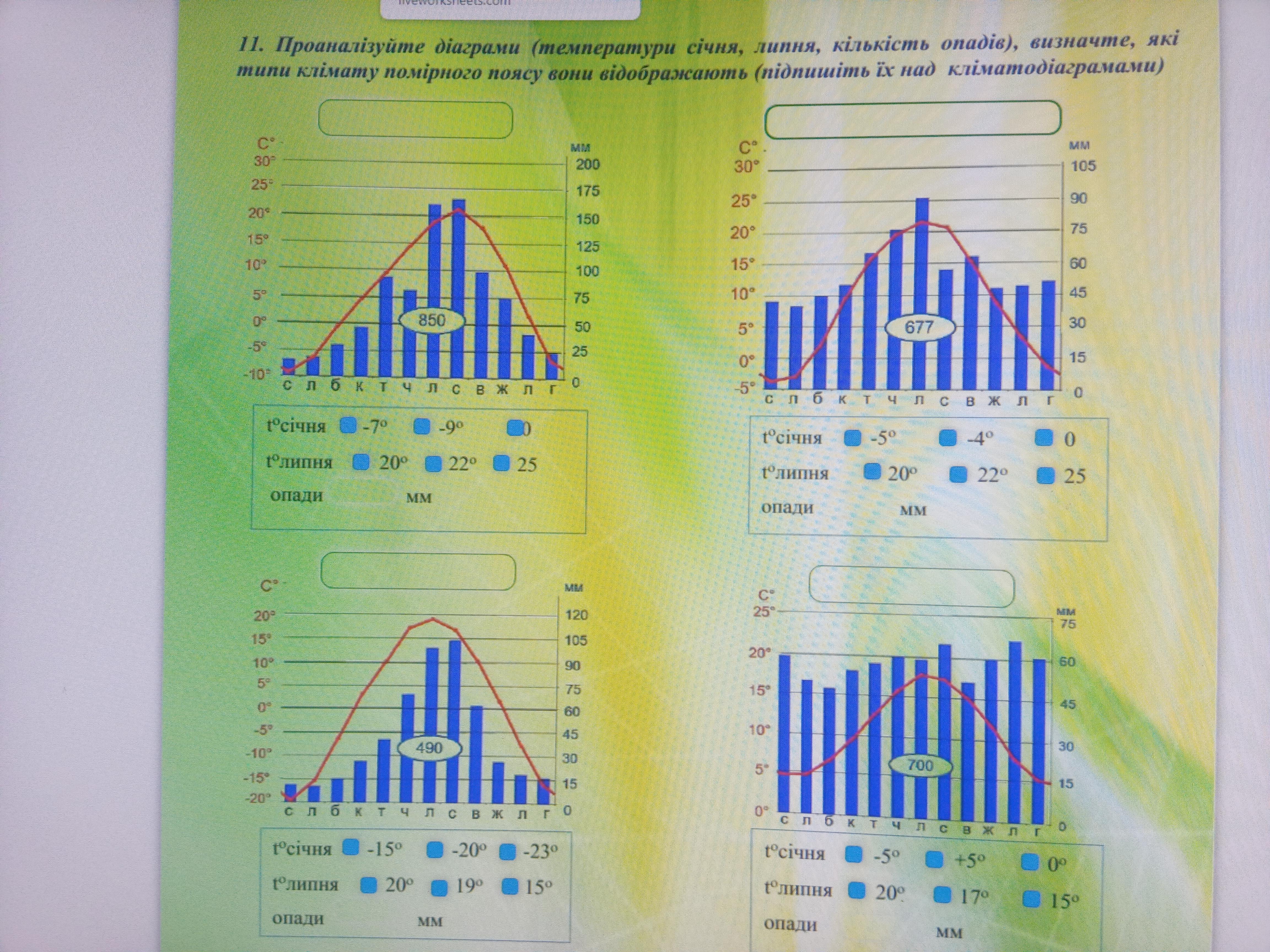 - Проаналізував діаграми (температури січня, липня, кількість опадів), ми визнали, які типи клімату помірного поясу вони відображають.Вони підписані над їх кліматодіаграмами