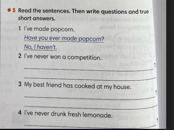 *5 Read the sentences. Then write questions and true short answers. edi ni zdieverf to mot achev armot hod 1 I've made popcorn. Papoq Have you ever made popcorn? nob No, I haven't. 2 I've never won a competition. edow S echn4hbe om emos Farant's bo Fairlo? 3 My best friend has cooked at my house. 4 I've never drunk fresh lemonade. bo novo ? Помогите пожалуйста