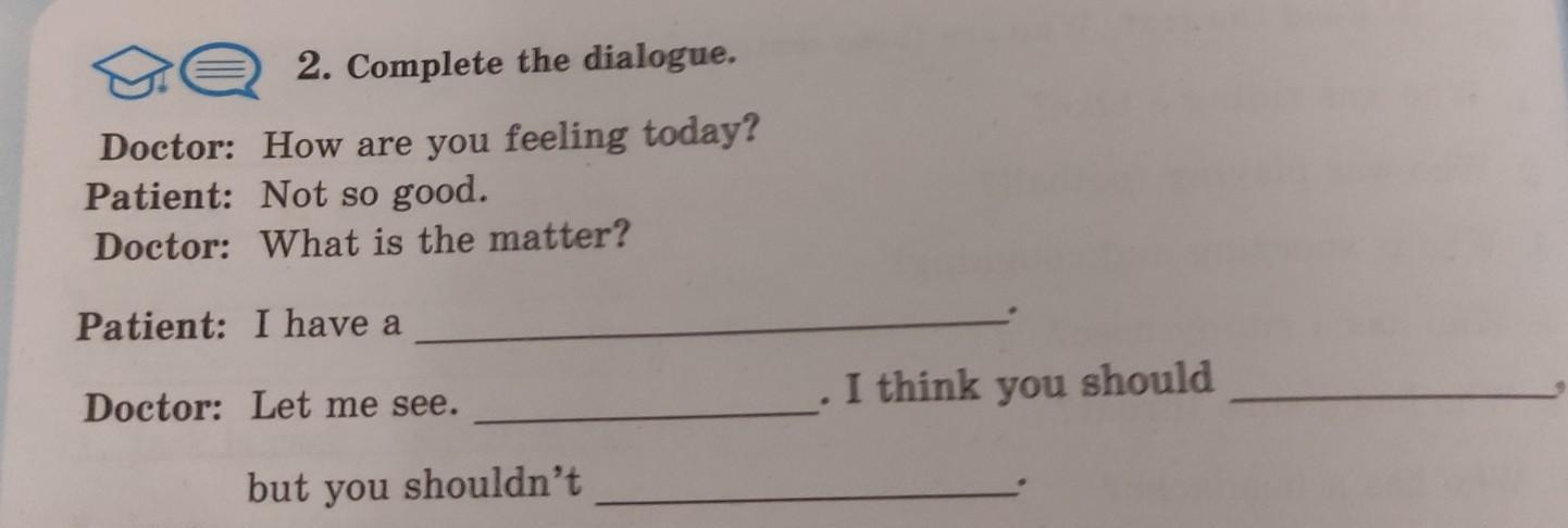 2. Complete the dialogue. Doctor: How are you feeling today? Patient: Not so good. Doctor: What is the matter? Patient: I have a Doctor: Let me see. but you shouldn't I think you should