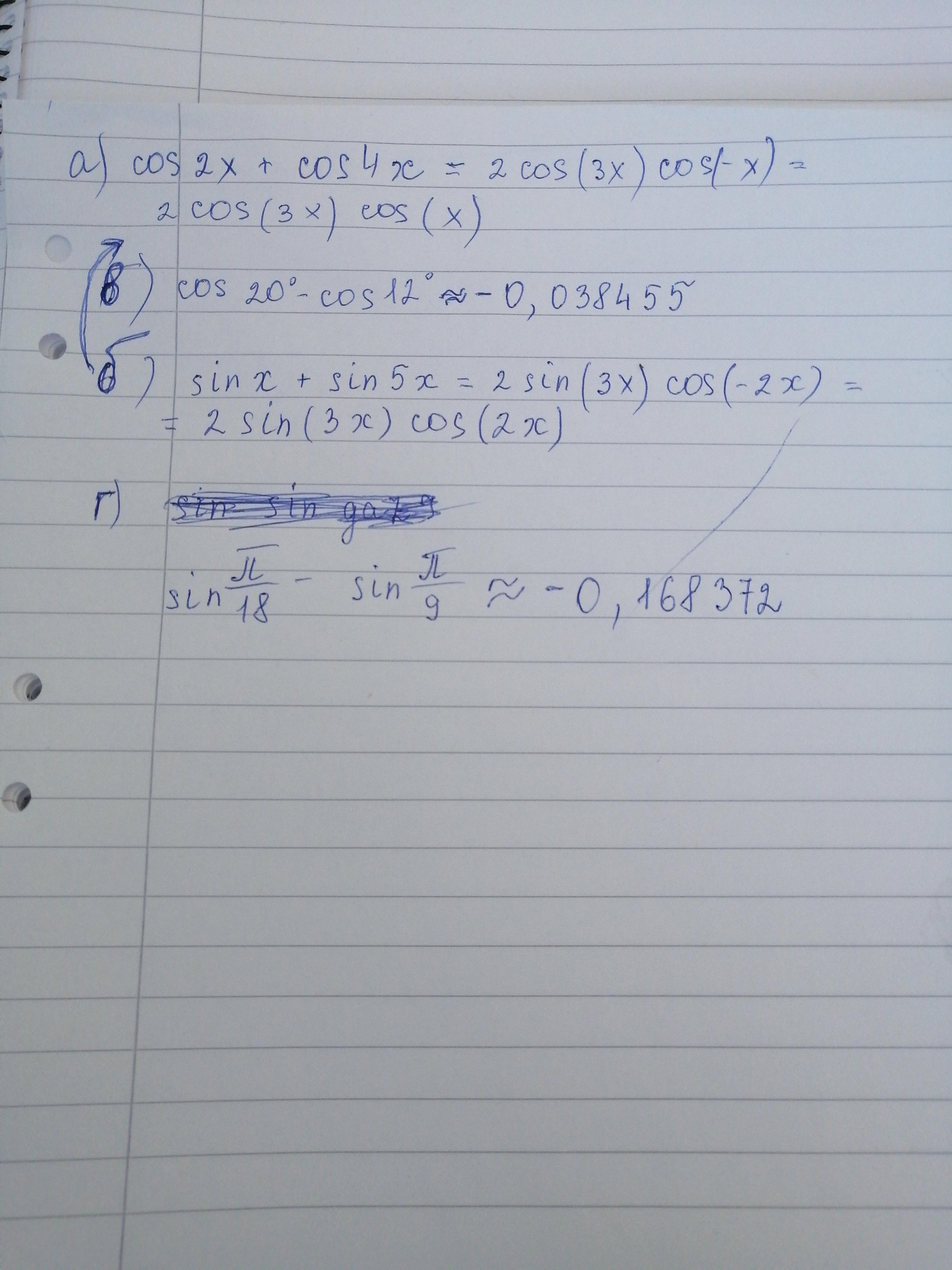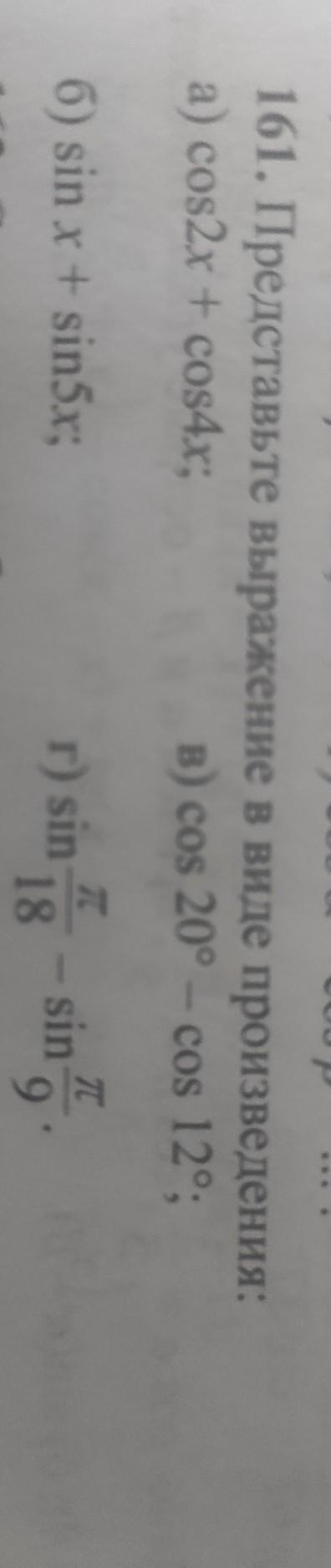 161. Представьте выражение в виде произведения: a) cos2x+cos4x; B) cos 20° - cos 12°; 6) sin x + sin5x; П 18 r) sin- sin gaz 9
