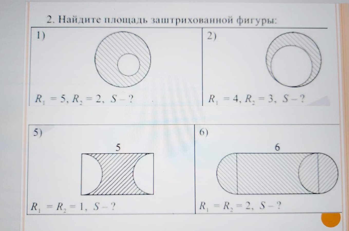 2. Найдите площадь заштрихованной фигуры: 1) 2) R = 5, R, = 2, S - ? 5) 5 D R, = R, = 1, S-? 6) о R, = 4, R, = 3, S-? 6 R = R, = 2, S-? 1