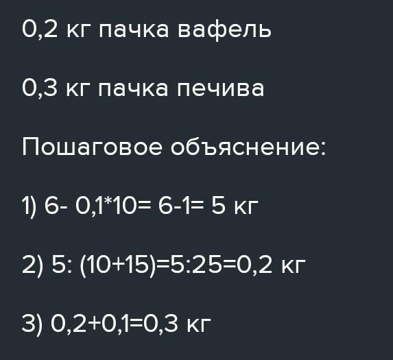 Відповідь: 1 упаковка вафель важить 0.2 кг,а печива 0.3 кг