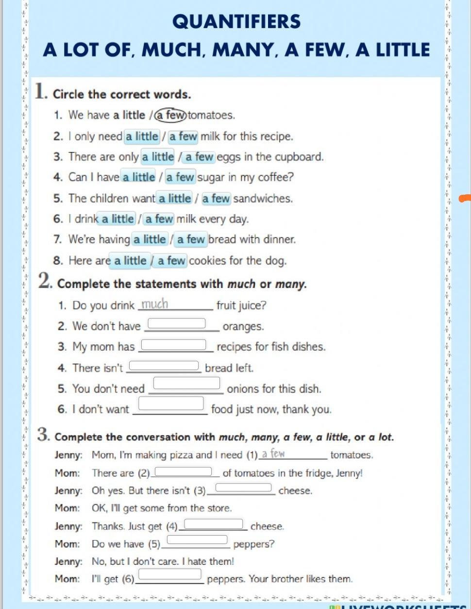 1. a few 2. a lot 3. much 4. a little 5. a few(many) 6. many (a few).