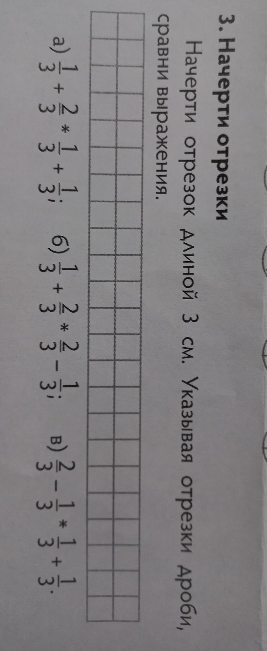 3. Начерти отрезки Начерти отрезок длиной 3 см. Указывая отрезки дроби, сравни выражения. 4 33 a) 3-1·1·1 аз ✓ 2 1 3 3 3' 4 4 1.2.2 1. 33 4 3 3) 4