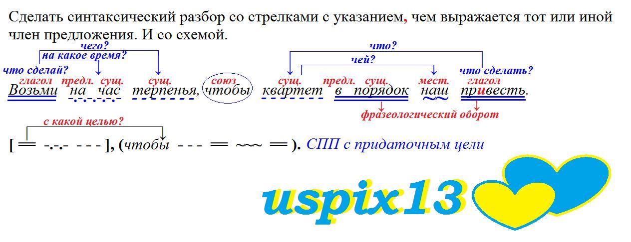 Возьми на час терпенья, чтобы квартет в порядок наш превесть. Сделать синтаксический разбор со стрелками с указанием чем выражается тот или иной член предложения. И со схемой.