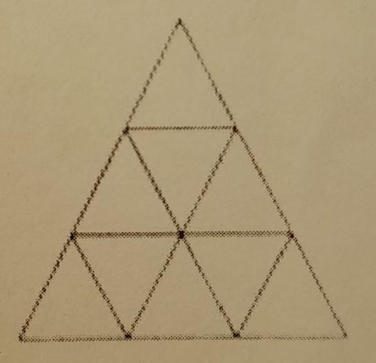 На листе бумаги нарисован правильный треугольник со стороной, равной п После этого рисунок разбит на единичные треугольники, как на рисунке для n=3. Сколько различных треугольников вы сможете найти на этом рисунке? Треугольники считаются различными, если они различаются либо по размерам, либо по расположению. Решите эту задачу для n=3 и n=4.