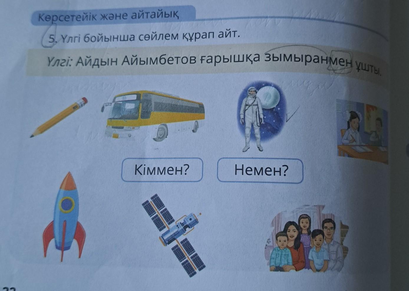 Әкесі Аидынға не туралы Көрсетейік және айтайық 5. Үлгі бойынша сөйлем құрап айт. Үлгі: Айдын Айымбетов ғарышқа зымыранмен ұшты. 22 Кіммен? Немен? СРОЧНОООО