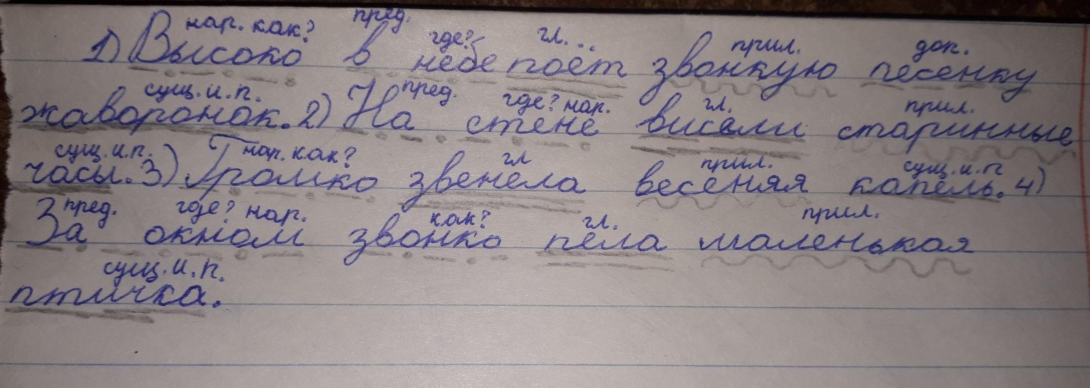 16. Спиши предложения. Выполни их синтаксический разбор (разбери по членам предложения). Обозначь, какой частью речи выражен каждый член предложения. 1. Высоко в небе поёт звонкую песенку жаворонок. 2. На стене висели старинные часы4. 3. Громко звенела весенняя капель4. 4. За окном звонко пела маленькая птичка. НАПИШИТЕ ПОЖАЛУЙСТА НА ЛИСТОЧКЕ!!! ПРОШУ ВАС