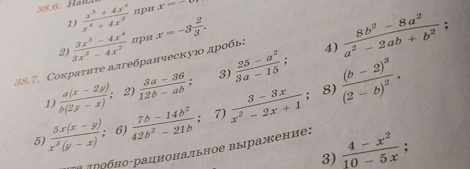 3x 3x³ - 4x² 38.7. Сократите алгебраическую дробь: 1) a(x-2y) b(2y-x) 5.x(x-y) ; 6) x³ (y-x) 5) 2) 2) 3а - 36 12b - ab ; 7b - 146² 426² - 216 3) 3 - 3x x² - 2x + 1 выражение: ; 7) 25 - a² 3а - 15 TT TOP 8b² - 8a² 4) a2 - 2ab + b² 8) (b − 2)³ (2 - b)2