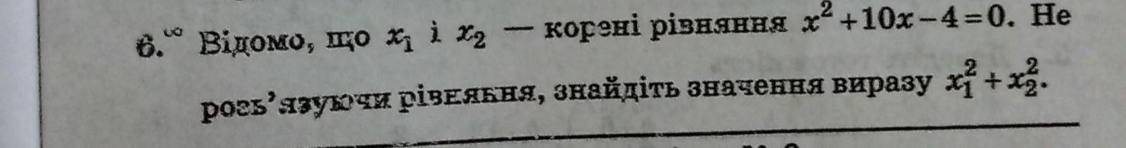 {x}^{2}  + 10x - 4 = 0 \\ x_{1}  + x _{2} =  - 10 \\ x_{1}  \times x _{2} =   - 4 \\  (x_{1} +    x _{2}) {}^{2}  = x {}^{2} _{1}  +   2x_{1}  x _{2}  +   x  {}^{2} _{2}  \\  x {}^{2} _{1}   +    x  {}^{2} _{2}  =  x {}^{2} _{1}  +   2x_{1}  x _{2}  +   x  {}^{2} _{2}  - 2 x_{1} x _{2} =  \\  (  x_{1}  + x _{2} ) {}^{2}  - 2 x_{1} x _{2}  =  \\ ( - 10) {}^{2}  - 2 \times ( -4 ) = 100 + 8 = 108