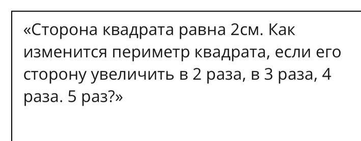 «Сторона квадрата равна 2см. Как изменится периметр квадрата, если его сторону увеличить в 2 раза, в 3 раза, 4 раза. 5 раз?»