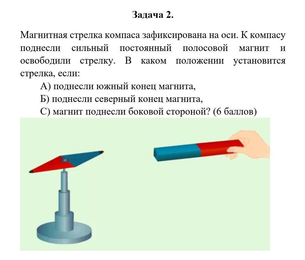 Магнитная стрелка компаса зафиксирована на оси. К компасу поднесли сильный постоянный полосовой магнит и освободили стрелку. В каком положении установится стрелка, если: А) поднесли южный конец магнита, Б) поднесли северный конец магнита, С) магнит поднесли боковой стороной?