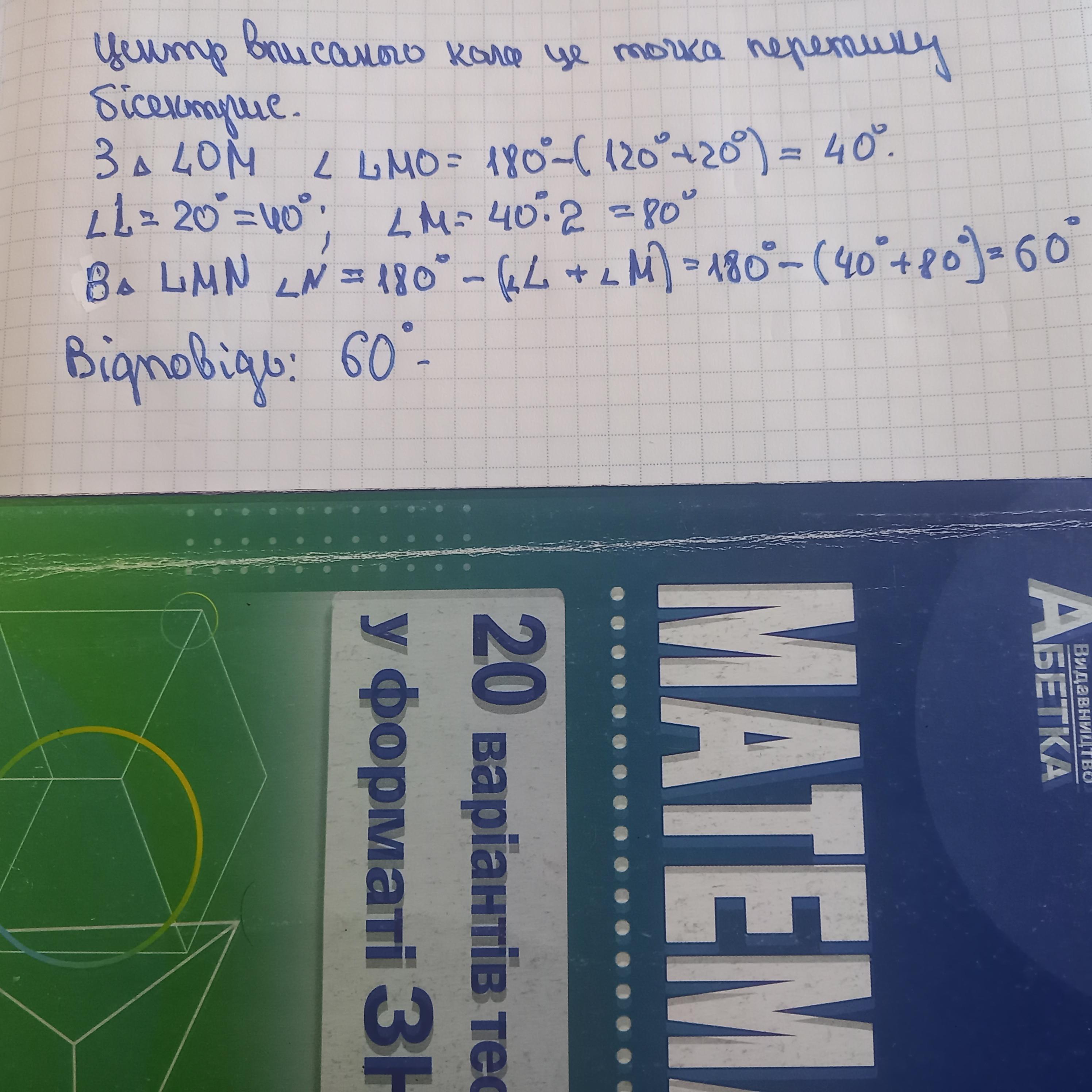 Получим, в треугольнике NLM, угол LNM=180-2*OLM-2*OML-180-2*20-2*40=60