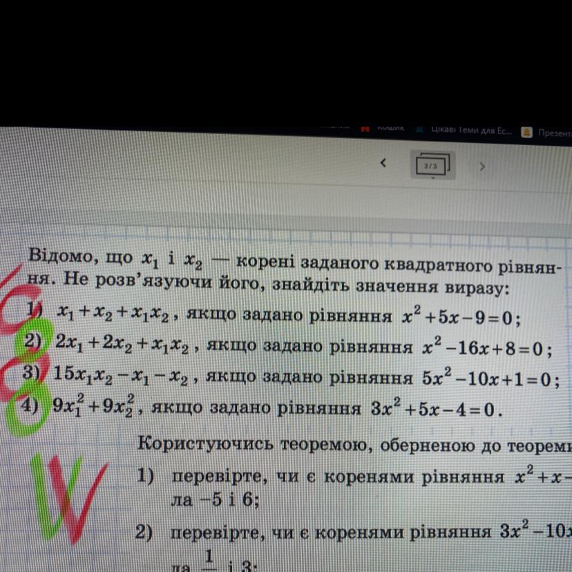 Відомо, що х1 і х2 - корені заданого квадратного рівняння. Не розв’язуючи його, знайдіть значення виразу: