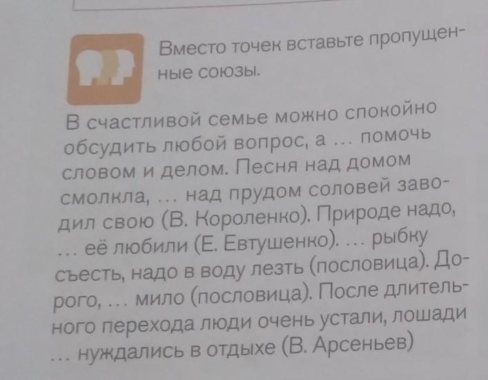 Вместо точек вставьте пропущенные союзы. В счастливой семье можно спокойно обсудить любой вопрос, а ... помочь словом и делом. Песня над домом смолкла, над прудом соловей заво- дил свою (В. Короленко). Природе надо, её любили (Е. Евтушенко). ... рыбку съесть, надо в воду лезть (пословица). До- рого, ... мило (пословица). После длитель- ного перехода люди очень устали, лошади нуждались в отдыхе (В. Арсеньев)