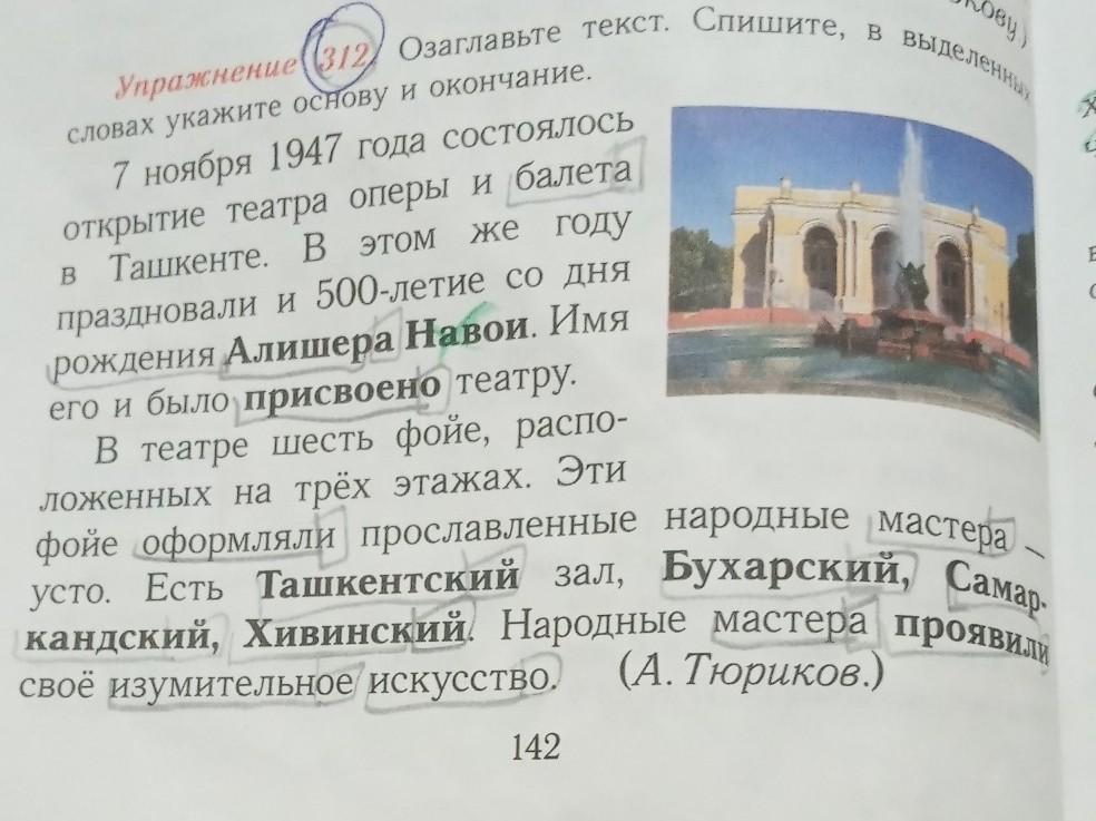 ние! o Н.Сладкову) Упражнение (312) Озаглавьте текст. Спишите, в выделенных словах укажите основу и окончание. 7 ноября 1947 года состоялось открытие театра оперы и балета в Ташкенте. В этом же году праздновали и 500-летие со дня рождения Алишера Навои. Имя его и было присвоено театру. В театре шесть фойе, распо- ложенных на трёх этажах. Эти фойе оформляли прославленные народные мастера усто. Есть Ташкентский зал, Бухарский, Самар. кандский, Хивинский. Народные мастера проявили своё изумительное искусство. (А.Тюриков.) 142