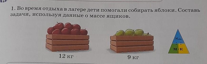 В 1 ящике было 12 кг яблок, а во втором — 9 кг. На сколько кг меньше яблок во 2 ящике, чем в 1 ящике?