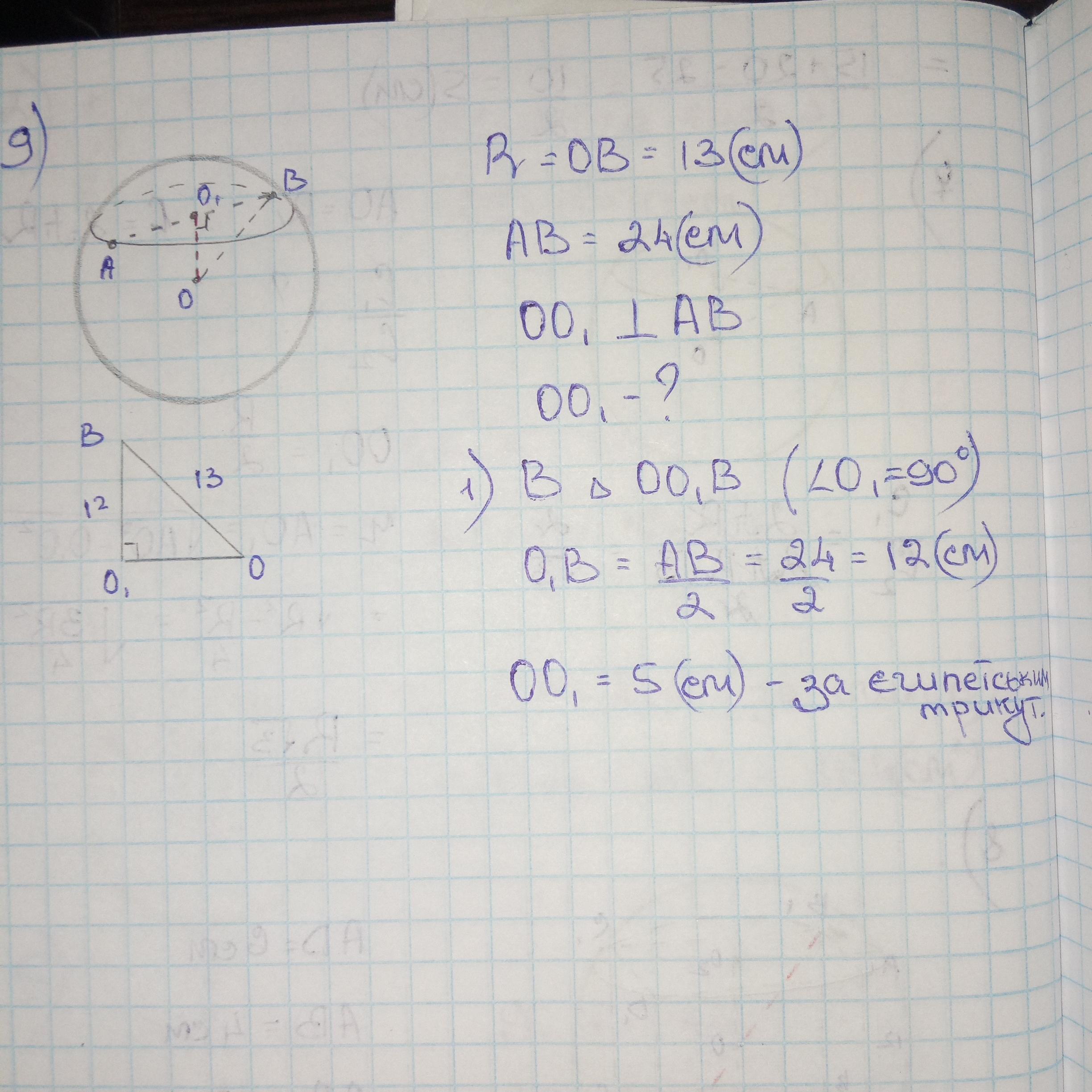 Точки А і В лежать на поверхні кулі радіусом 13 см. Якщо відрізок АВ дорівнює 24 см, то відстань від центра кулі до відрізка АВ дорівнює: