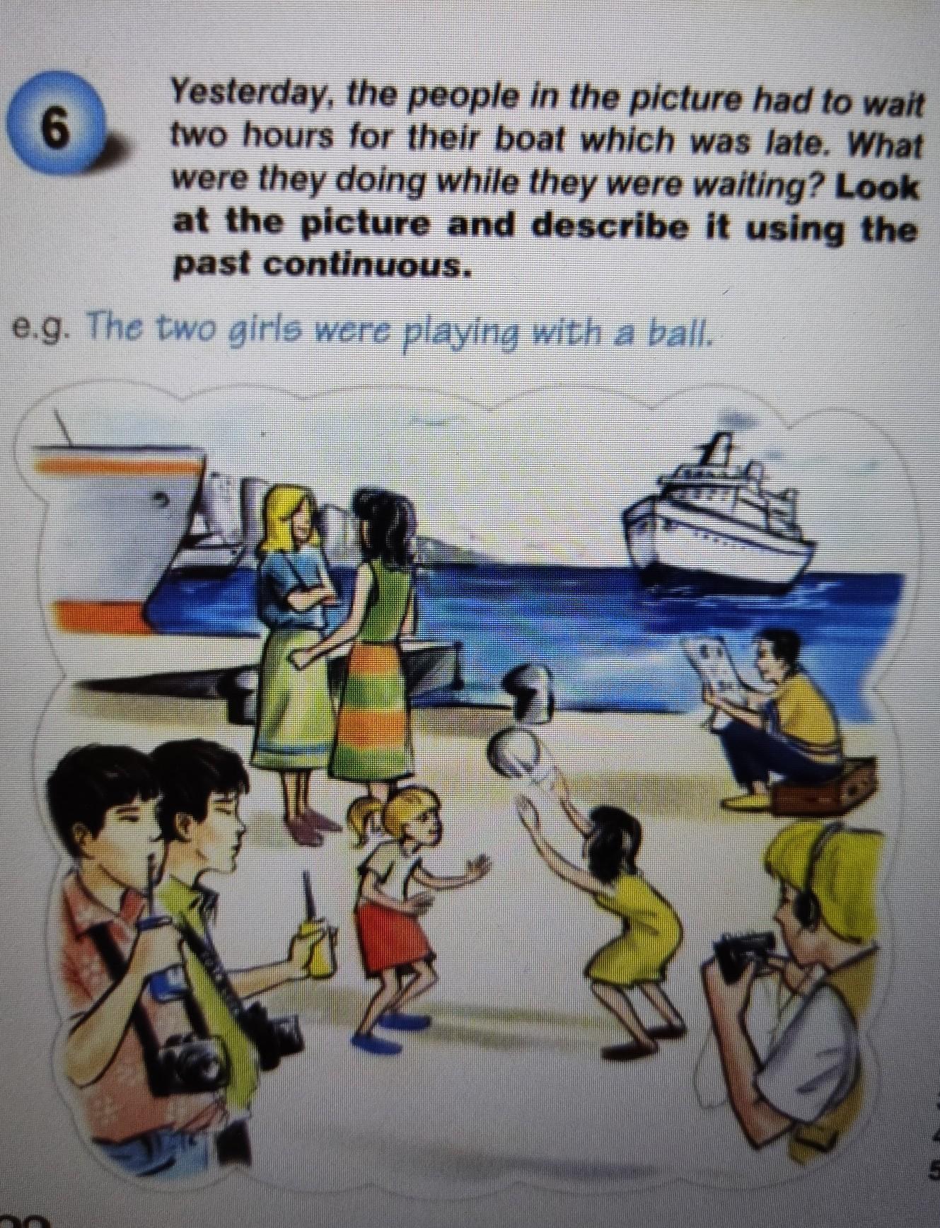 Yesterday, the people in the picture had to wait two hours for their boat which was late. What were they doing while they were waiting? Look at the picture and describe it using the past continuous.
