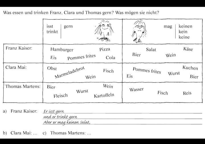 1. Er isst gern Eis, Hamburger, Pizza und Pmmes frites.