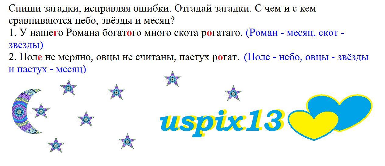 501. Спиши загадки, исправляя ошибки. Отгадай загадки. С чем и с кем сравниваются небо, звёзды и месяц? 1. У нашево Романа богатаго много скота рагатаго. 2. Поли не меряно, овцы не считаны, пастух рагат.