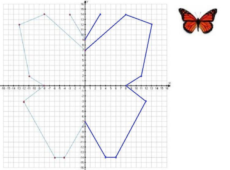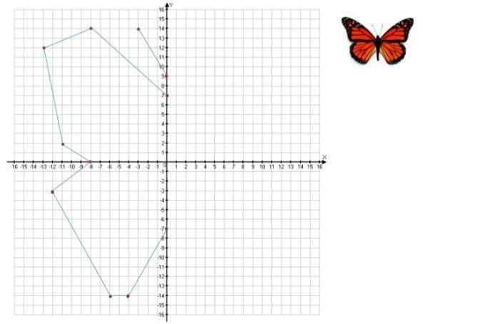 Визначте координати точок, по яких намальовано ліву частину метелика, розставте точки для зображення правої частини метелика та домалюй його. Запишіть координати нових.