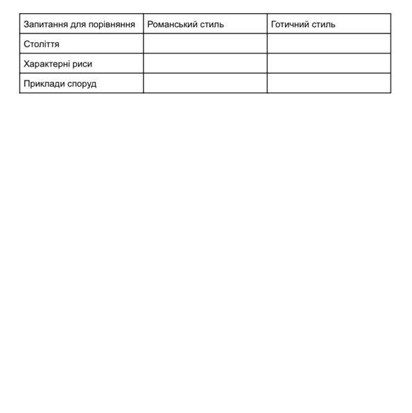 Романський - масивні підстави, товсті, міцні, важкі стіни, безліч заокруглених арок, міцні колони, тупі і низькі вежі, потужні склепіння, великі башти і незначні декоративні аркади, невеличкі вікна, тому простір всередині був слабо освітлений, дерев*яний дах, чітко визначена форми, основна риса яких - простота. Це споруди горизонтального низького типу.