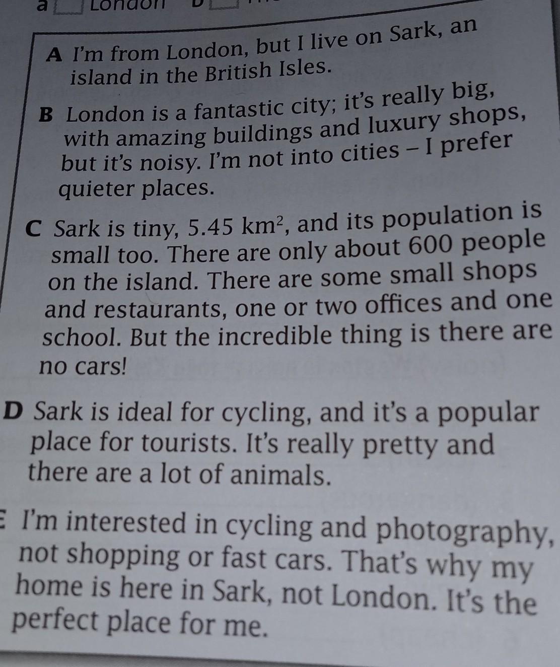4 *** Answer the questions. Write complete sentences. Where does Dan live? He lives on Sark, an island in the British Isles. 1 Why does Dan think London is a good place. to live? 2 Why doesn't Dan like living in cities? 3 How big is Sark? 4 What is special about Sark? 5 What do tourists like doing on Sark? 6 What is Dan interested in?