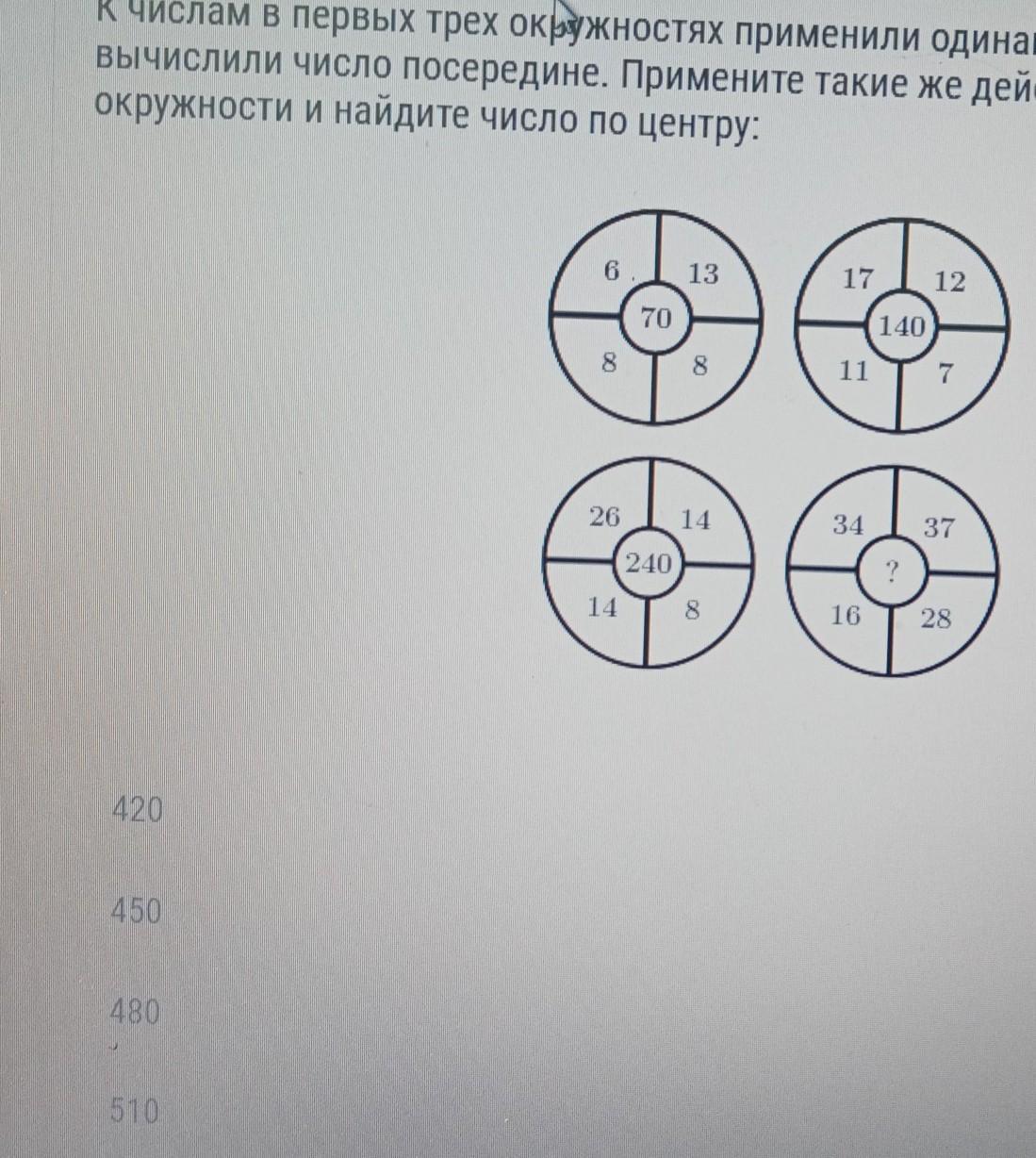 Вопрос №19 К числам в первых трех окружностях применили одинаковые действия и вычислили число посередине. Примените такие же действия к четвертой окружности и найдите число по центру: