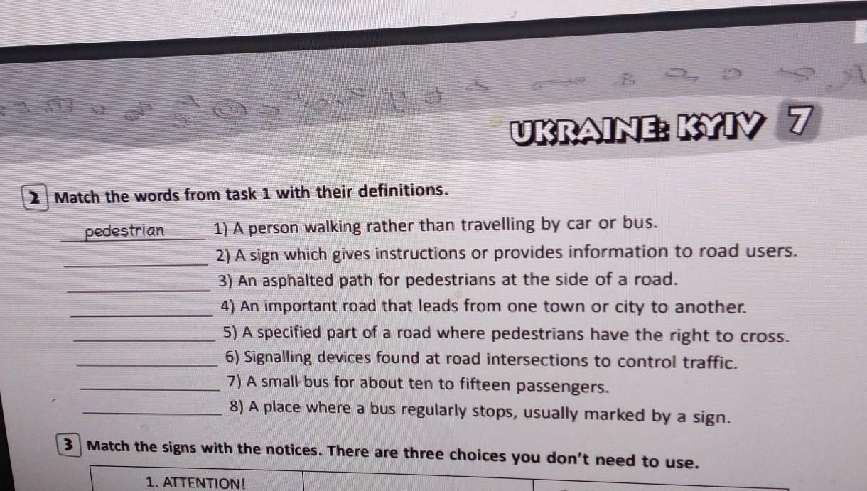 from task 1 with their definitions. 1) A person walking rather than travelling by car or bus. 2) A sign which gives instructions or provides information to road users. 3) An asphalted path for pedestrians at the side of a road. 4) An important road that leads from one town or city to another. 5) A specified part of a road where pedestrians have the right to cross. 6) Signalling devices found at road intersections to control traffic. 7) A small bus for about ten to fifteen passengers. 8) A place where a bus regularly stops, usually marked by a sign signs with the notices. There are three choices you don't need to use. ATTENTION!