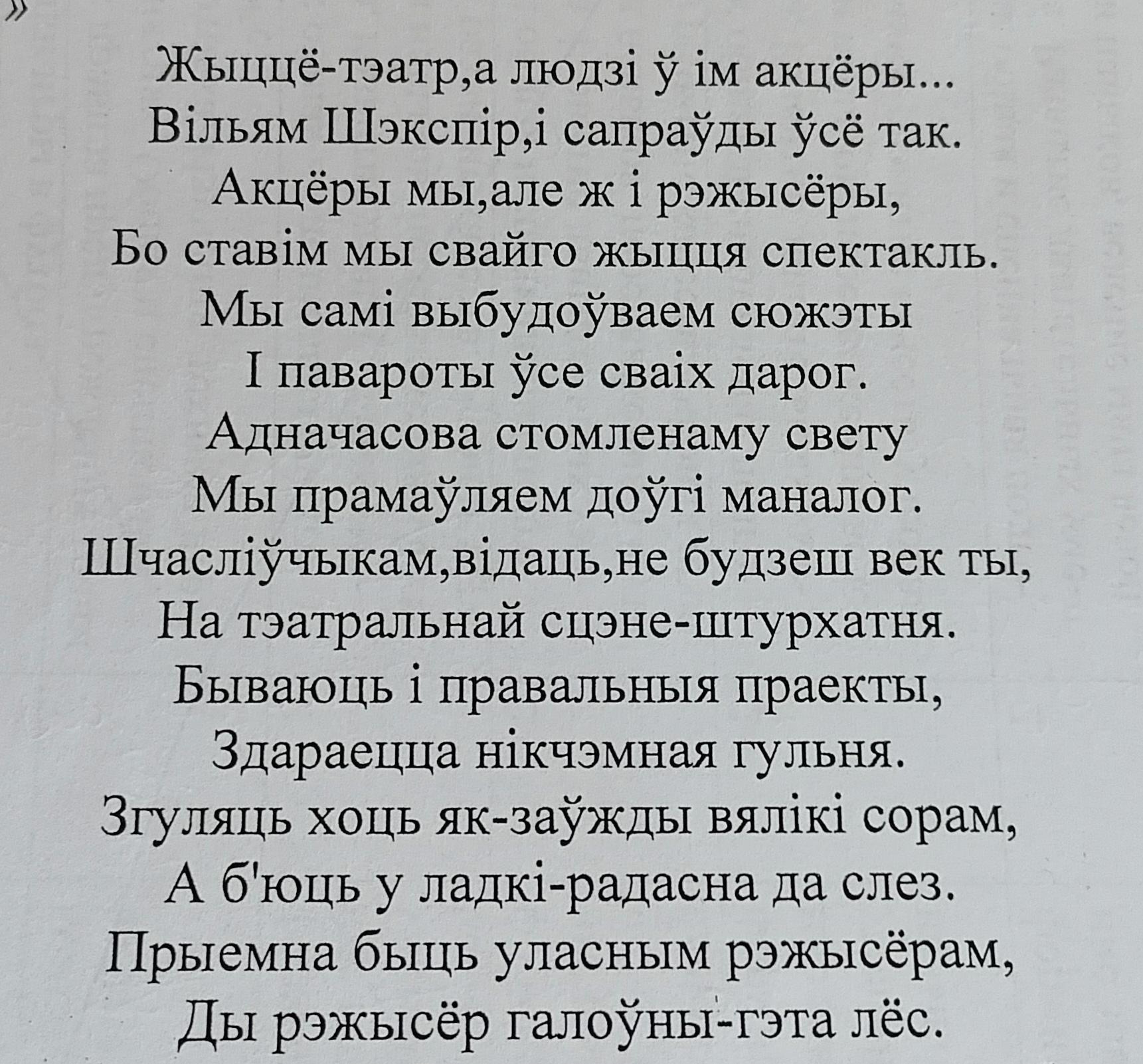 Гэты верш вымаўляе аўтар падчас адной з апошніх спадарожных сустрэчаў. Аўтар у гэтым вершы супастаўляе жыццё з тэатрам, дзе людзі выконваюць ролі акцёраў. Ён стварае метафару, паказваючы, што жыццё, як і тэатр, складаецца з роляў, якія гуляюць людзі. Жыццё можа быць красіўным, як добра сцэнарызаваная п'еса, а можа быць і драматычным, як трагедыя.