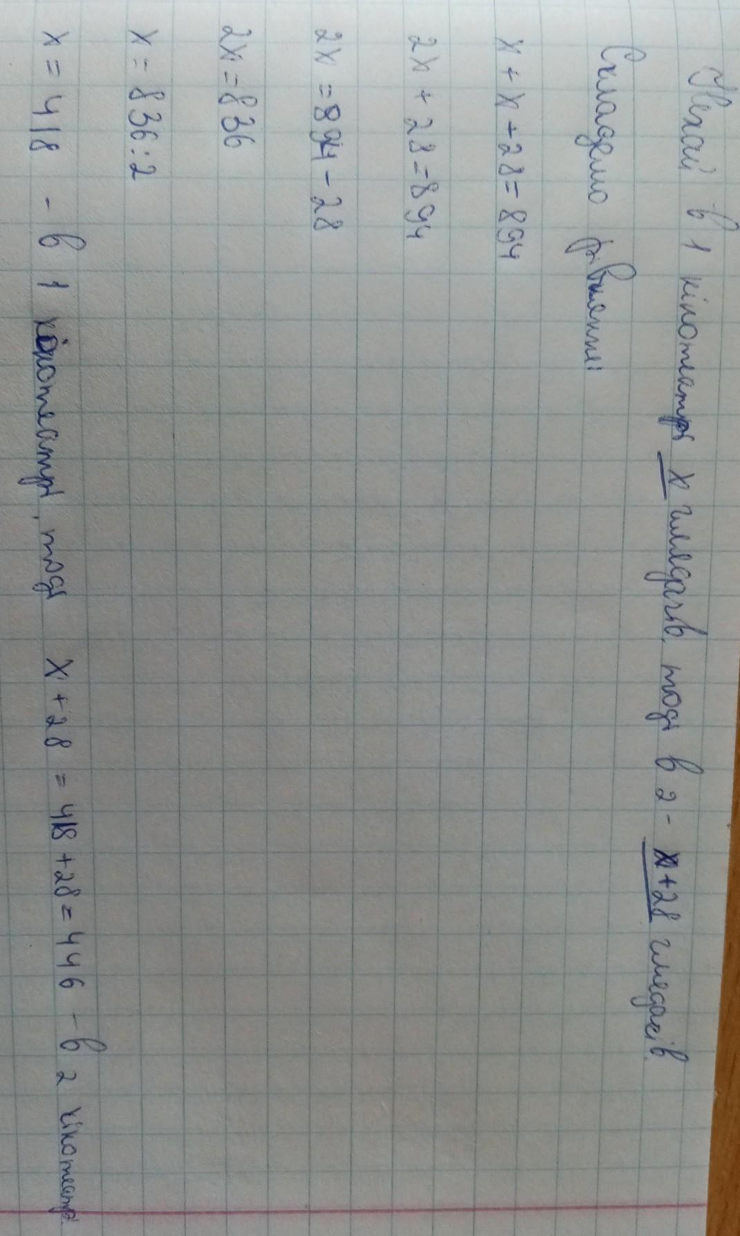 У двох залах кінотеатру було 894 глядачів. Після того, як з малого залу кінотеатру перейшло у великий 28 чоловік, то в обох залах стало глядачів порівну. Скільки глядачів було у кожному залі спочатку?