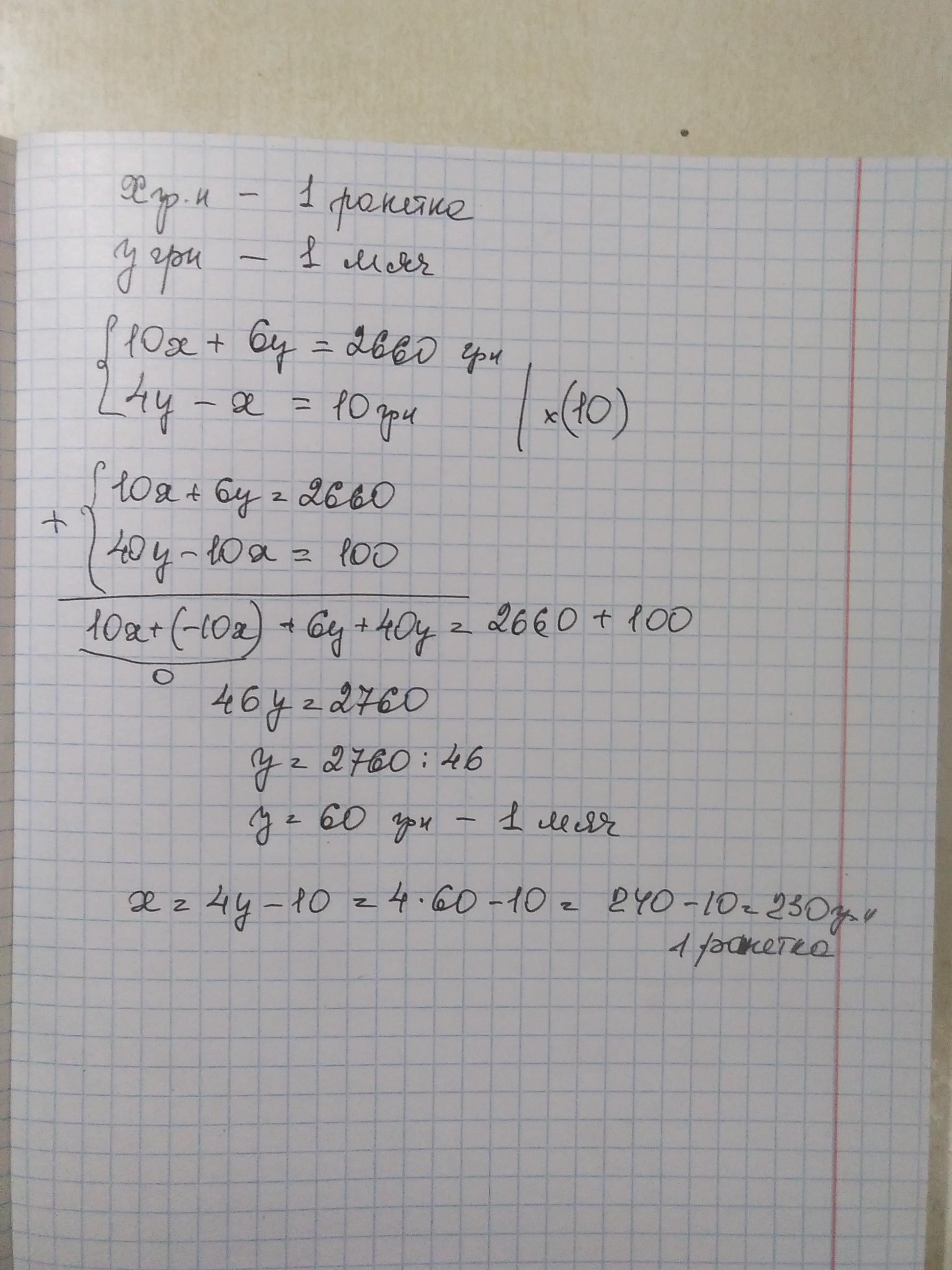 Марко та Стефа обожнюють грати у теніс. Для своїх тренування друзі придбали 10 ракеток та 6 м'ячів на суму 2660 грн. Скільки коштує 1 ракетка і скільки коштує м'яч, якщо відомо, що 1 ракетка дешевша за 4 м'ячі на 10 грн.