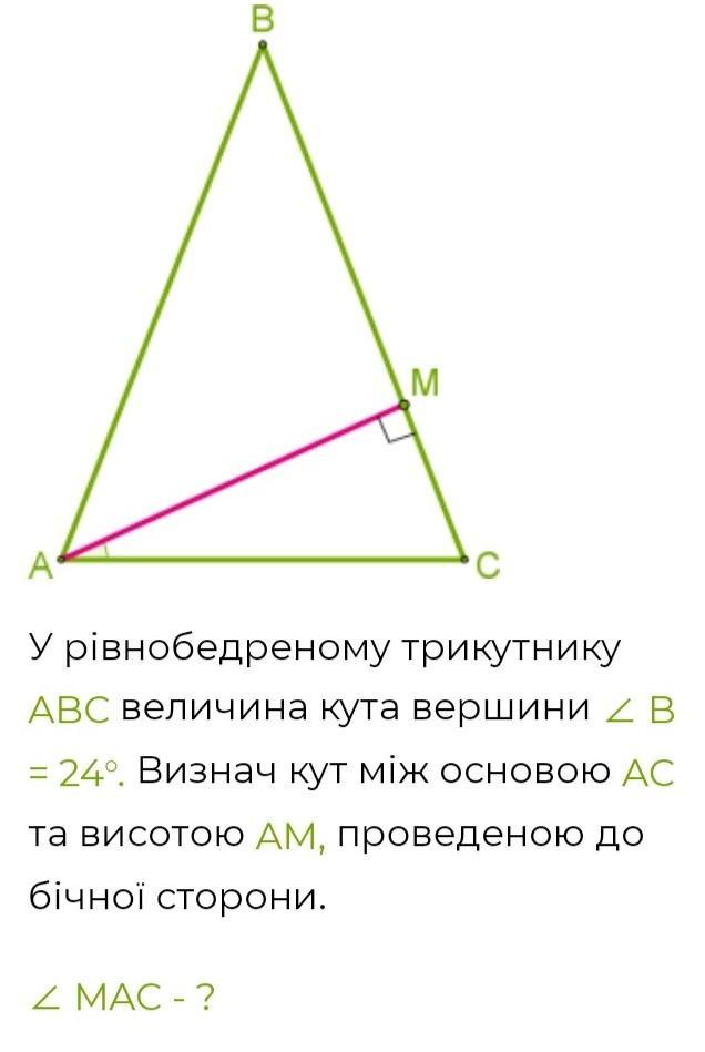 У рівнобедреному трикутнику ABC величина кута вершини ∠ B = 24°. Визнач кут між основою AC та висотою AM, проведеною до бічної сторони.