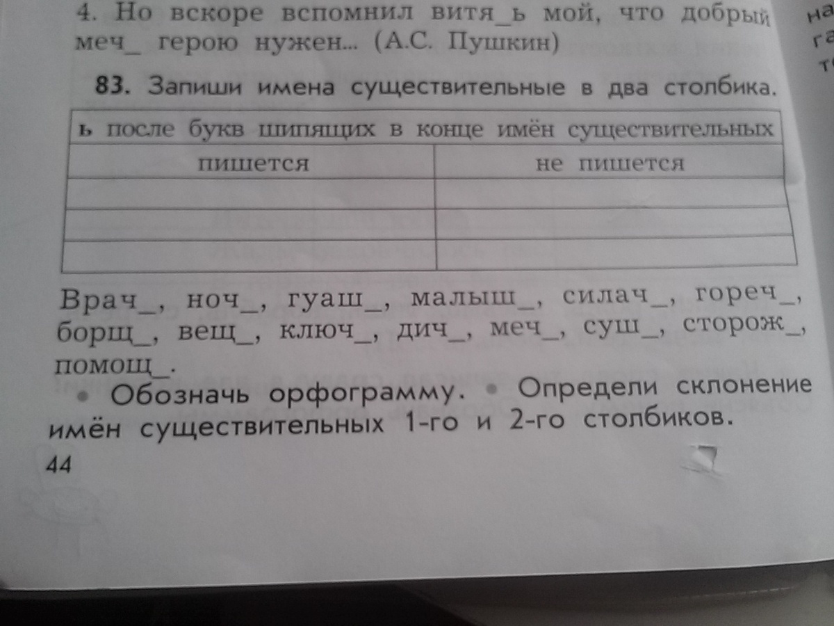 1 столбик: ночь, гуашь, горечь, вещь, дичь, сушь, помощь- все существительные женского рода, с нулевым окончанием и мягким знаком на конце, следовательно это слова 3-его склонения.